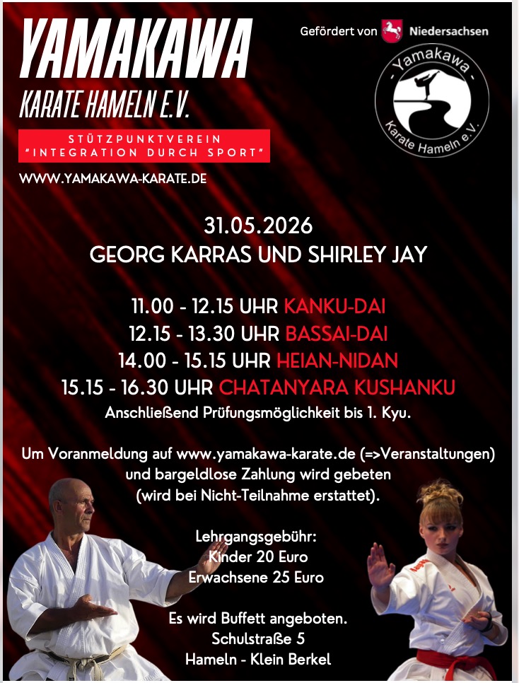 Kata-Lehrgang in Hameln Posted May 31, 2026February 18, 2026 georgkarras Map Unavailable Date/Time Date(s) - 31/05/202611:00 - 16:00 Categories